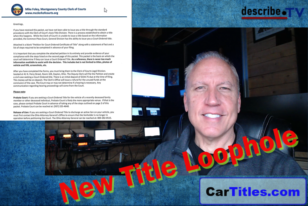 The Court Order Title Process: A Hidden SolutionSo what is the loophole well it’s not really a loophole it’s a process that’s been around for decades that every state has available to get a title here’s an example from Ohio Montgomery County Ohio it says greetings if you have received this packet we have not been able to issue a title through the standard procedures auto title does that sound like you haven’t been able to get title through standard procedures what does it say next it says there is a process established to obtain a title when this happens make it a little bit bigger when the clerk of court is unable to issue a title based on the information provided the Common Pleas Court has the ability to issue a court order title that’s what it says now people hear the word court and a lot of times they say I don’t want to go to court it’s too hard here’s the thing your perception of court is watching Law and Order watching Jack McCoy in a big court case with hearings and juries and evidence and attorneys that’s not what this is this is an administrative process it’s done behind the scenes in the office it’s not done in a big courtroom case.