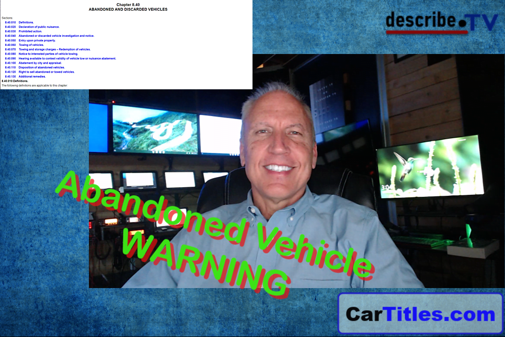 Common Queries about Abandoned VehiclesNow, there may be a few jurisdictions, some cities and counties, that have other ways of doing this, but even if they do, it’s not the best way to go. More than likely, the first question we ask when somebody calls up and says, hey, I have an abandoned vehicle, is our sales staff will ask, what did it just show up on your lot and somebody just brought it there? You don’t know where it came from? No, I bought it on eBay—that’s not abandoned. Oh, no, some guy gave it to me in exchange for, you know, cleaning out his gutters—that’s not abandoned. It was given to you, and that’s a good thing. If it was abandoned, remember what abandon means.