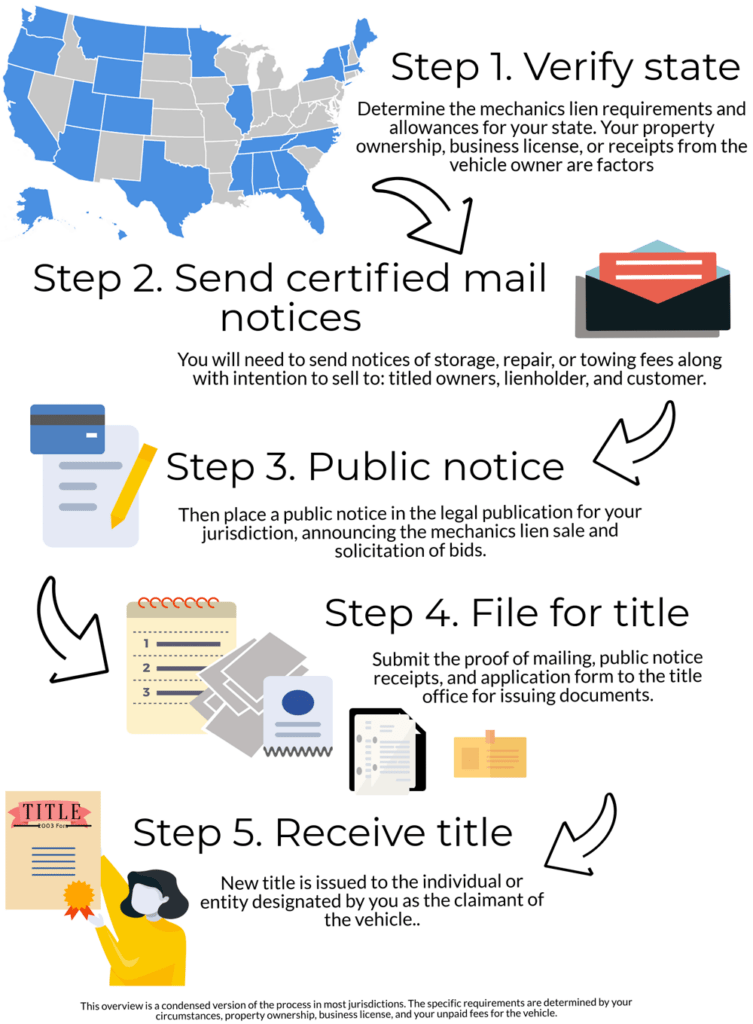 Our service can provide some of the steps required to complete this mechanic’s lien vehicle title process. In most states and jurisdictions, at least 4 steps are involved.