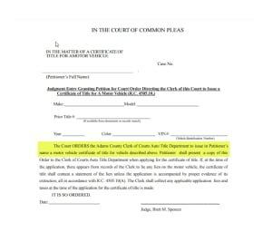 If you would like us to prepare the documents you would need for a court-ordered title, you can also order a paperwork package with some forms you would need.