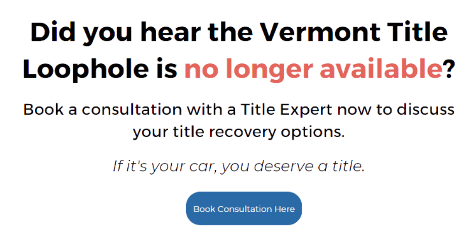 Be advised, Vermont no longer allows NON RESIDENTS TO TITLE A VEHICLE IN THE STATE OF VERMONT.  Click below to schedule a consultation to discuss alternative options.